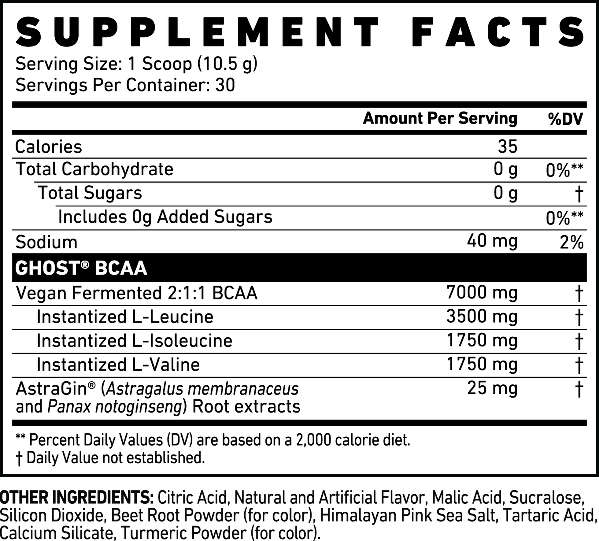 Mix each scoop (serving) of GHOST® BCAA with 8-10 oz of water or beverage of choice. Vary amount of liquid to taste. Consume during or after exercise on training days or throughout the day as a performance thirst quencher.
