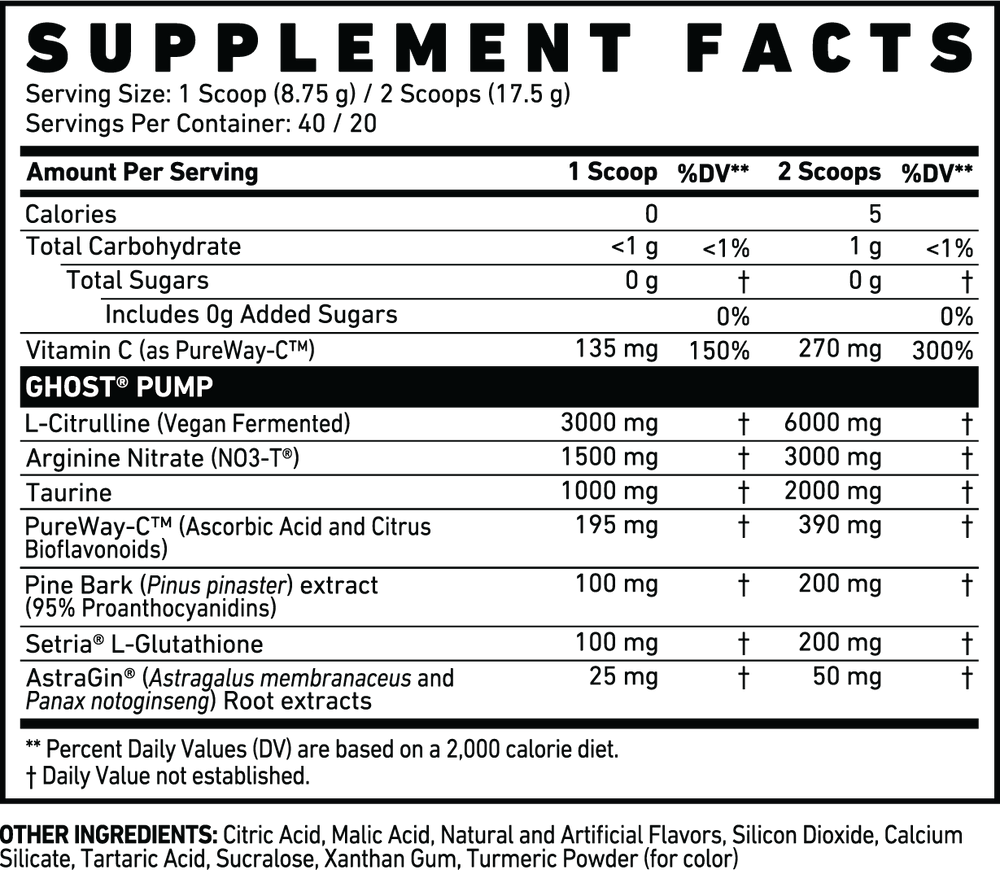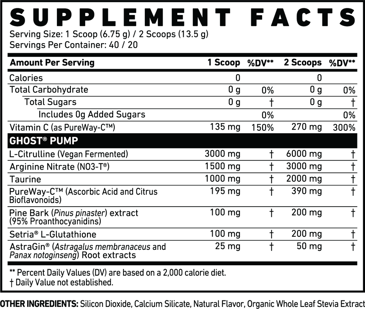 Mix one scoop (1 serving) of GHOST® PUMP with 6-8 oz of water or beverage of choice, such as GHOST LEGEND®, 30 minutes before exercise on training days. Advanced users/users over 160lbs, mix 1-2 scoops with 10-12oz of water prior to training.