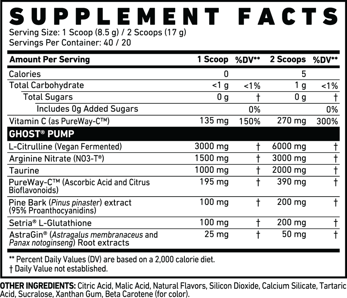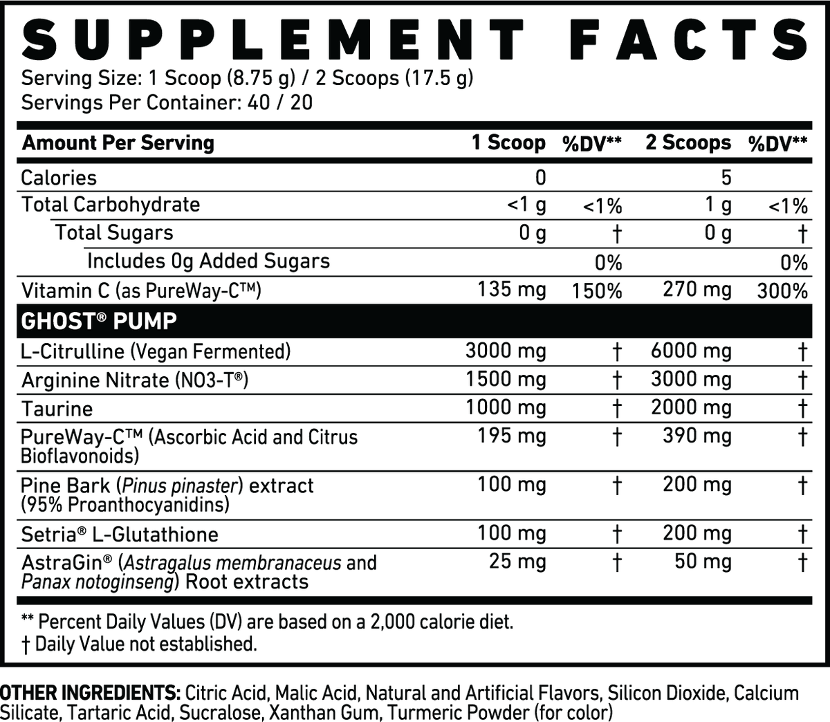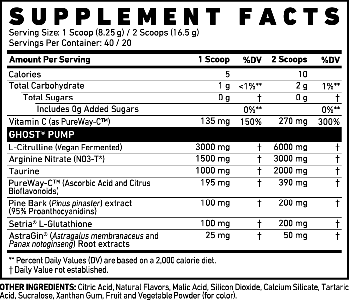 Mix one scoop (1 serving) of GHOST® PUMP with 6-8 oz of water or beverage of choice, such as GHOST LEGEND®, 30 minutes before exercise on training days. Advanced users/users over 160lbs, mix 1-2 scoops with 10-12oz of water prior to training.